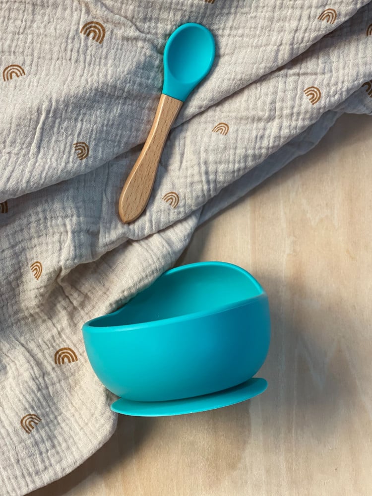 صُنع هذا الوعاء و الملعقة من السيليكون .يتميز بقابليته للالتصاق مما يقلل الانسكابات حيث يتعلم أطفالك كيفية إطعام أنفسهم.